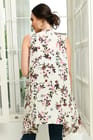 White and burgundy printed sleeveless open front longline waterfall shrug with asymmetric hem