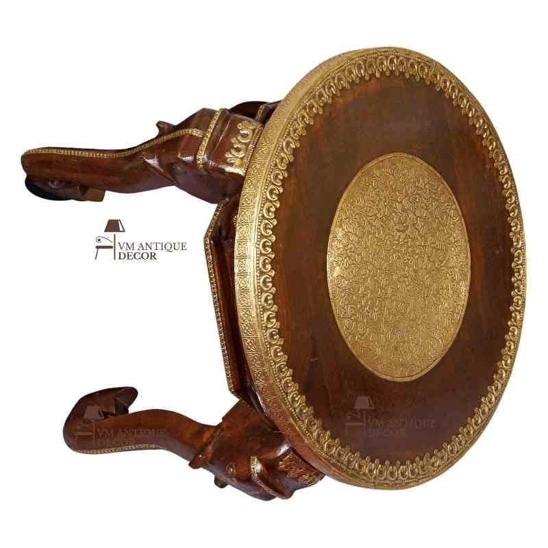 This handicraft-table can be used as end-table/side-table/coffee-table/cocktail-table/nightstand/lamp-table for bedroom/drawing-room decor. The table is decorated with brass metal work as well as shiny brown color which makes the table very attractive. To provide stability to the table, the round surface of the table is given stability by four elephant heads, the table has been carved in such a way that the trunks emerging from the four ends act as the legs of the table.