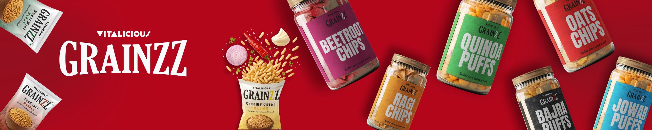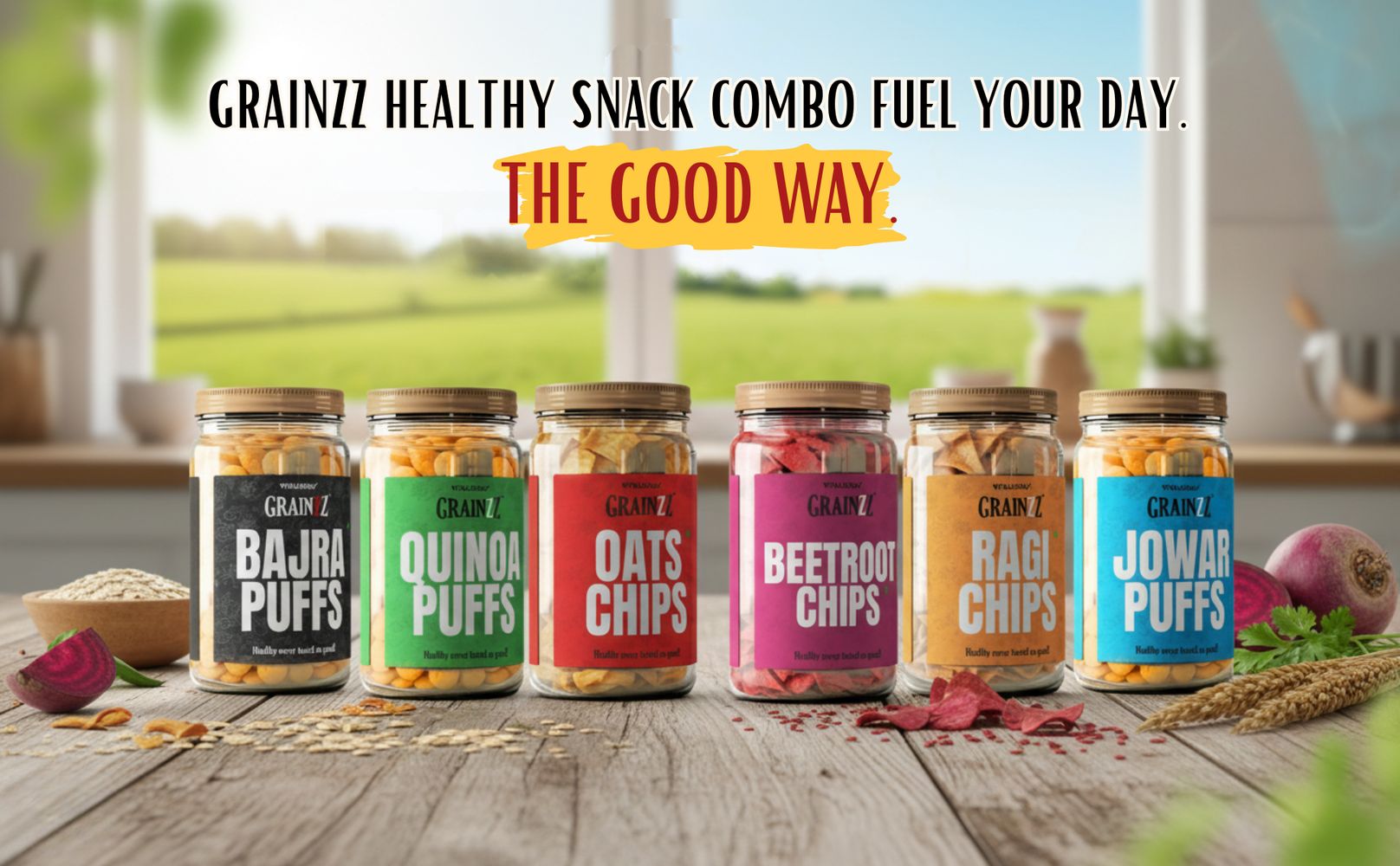 GRAINZZ - A Snacking StoreWelcome to GRAINZZ – India’s New-Age Healthy Snacking Brand At GRAINZZ, we believe snacking should be light, flavorful, and guilt-free—without compromising on taste. Born from a simple insight that one of India’s most loved grains was never given its due, GRAINZZ was created to turn everyday grains into hero snacks. We take real grains and millets, roast or craft them responsibly (never deep-fry where it doesn’t belong), and blend them with bold, familiar Indian flavors that make healthy snacking genuinely enjoyable. Our snacks are designed for modern Indian lifestyles—office breaks, late-night Netflix sessions, gym days, travel munching, and everything in between. What Makes GRAINZZ Different ✔ Made from Real Grains & Millets – Ragi, Oats, Jowar, Bajra, Quinoa & more✔ No Palm Oil – Cooked clean using better oils✔ 0% Trans Fat & Cholesterol-Free✔ Light on the Stomach, Big on Taste✔ No Added Preservatives✔ Made with Real Spices & Natural Flavours We focus on clean labels, honest nutrition, and bold flavours—so you can snack without second thoughts. Our Product Range 🥔 Veggie & Grain Chips – Ragi, Beetroot, Oats🌾 Supergrain Puffs – Jowar, Bajra, Quinoa🔥 Classic & Indian-Inspired Flavours – crafted to suit Indian taste buds Each product is thoughtfully created to offer crunch, satisfaction, and balance—not just empty calories. Our Mission To make healthy snacking mainstream in India by transforming traditional grains into modern, crave-worthy snacks that fit today’s lifestyle. Because for us, grains aren’t just ingredients, they’re the product. Snack smarter. Crunch happier.Welcome to the world of GRAINZZ.https://www.mystore.in/s/62ea2c599d1398fa16dbae0a/g/694262bd5ea08350ac6c5687/grainzz-logo-vk-480x480.jpg