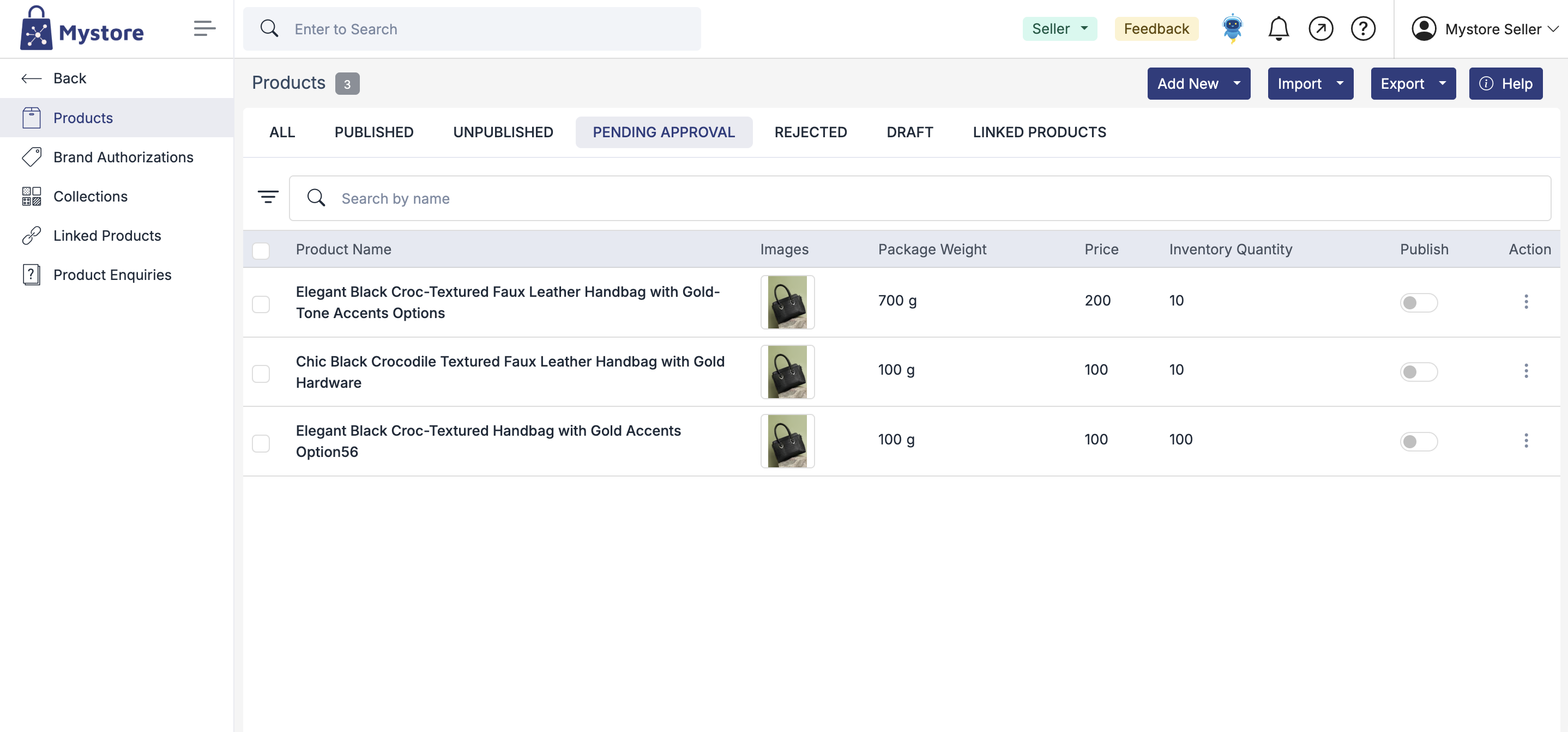 Step 9: Go to Products > Pending Approval. All your synced products should now be displayed on the Mystore dashboard.