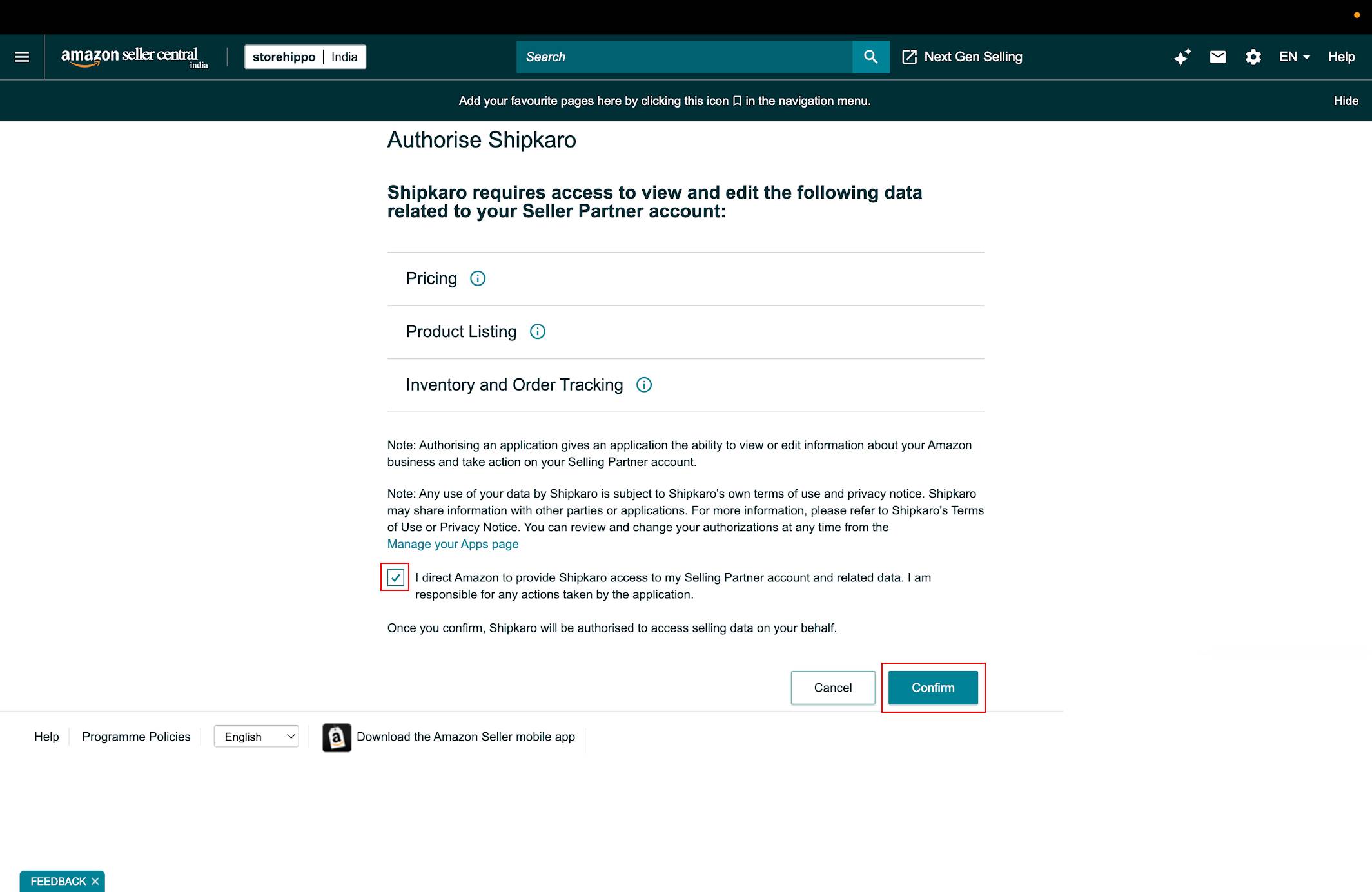 Note: Authorizing Mystore to access your Amazon product listings lets you sync order and inventory information from your Mystore dashboard. After the authorisation is completed, press “confirm” to proceed.
