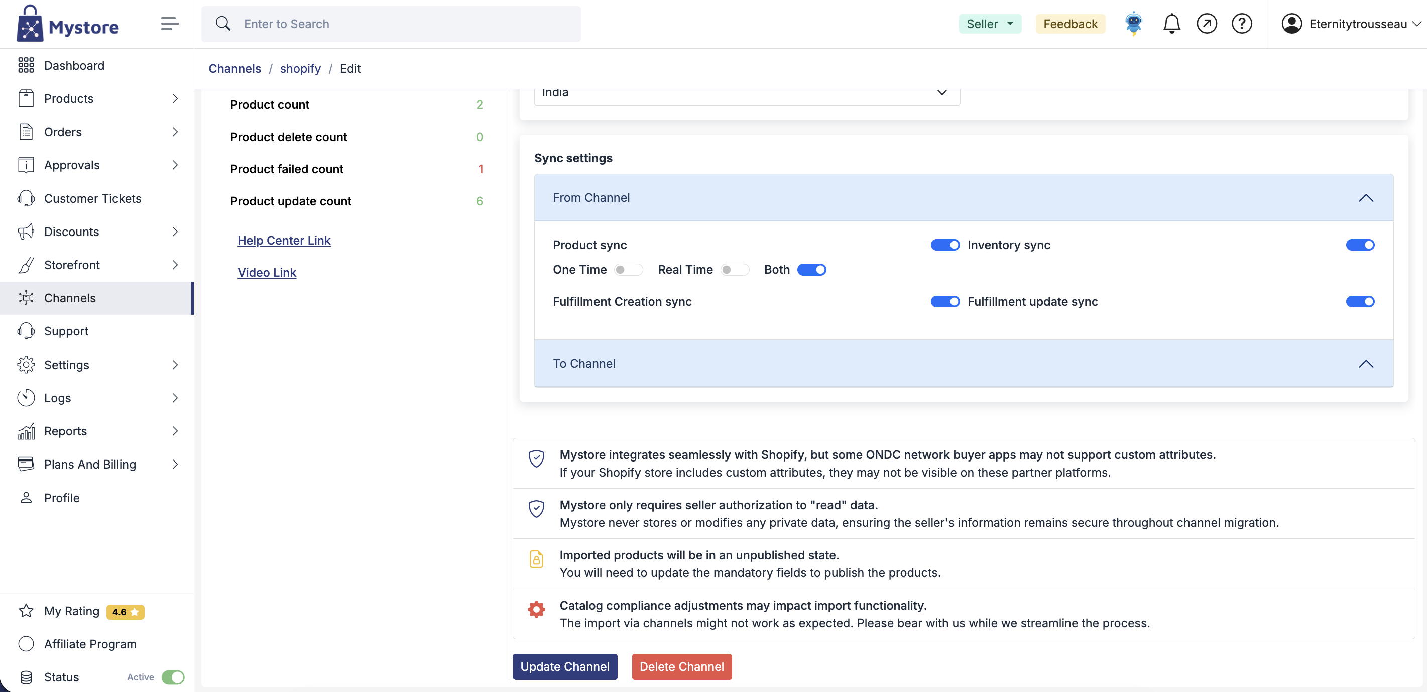 Important Note: As you continue to add products to your Shopify store, simply select your previously integrated channel and then update the same on the Mystore account to automatically migrate all products onto your Mystore admin panel.