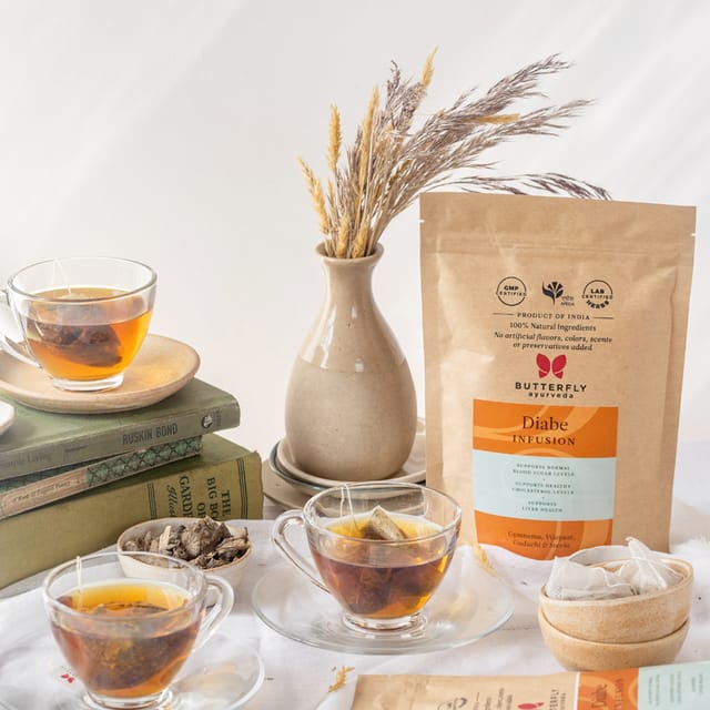 A herbal infusion for the diabetic and also, for those who have inherited a predisposition to the disease. With the goodness of Gurmar and Guduchi, and Sweetleaf Stevia, Diabe Infusion is a natural way of supporting healthy sugar and cholesterol levels. 100% caffeine-free, this herbal infusion tea for diabetes can be enjoyed anytime during the day or late evening.