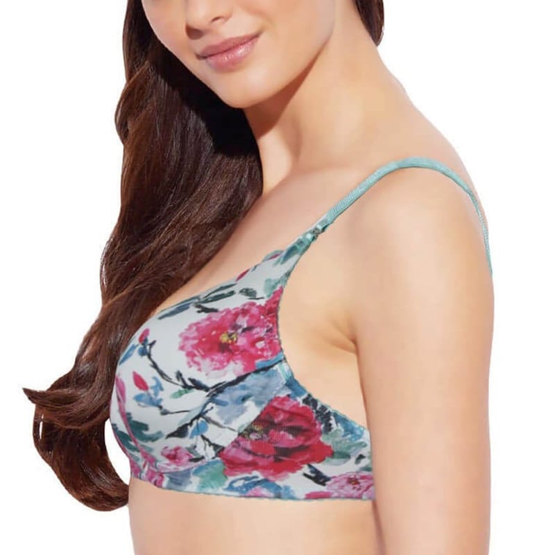 Very lightly padded for defined shape Wire-free for comfort and support 3/4th coverage for enhanced support 2 row varying column hook & eye back closure